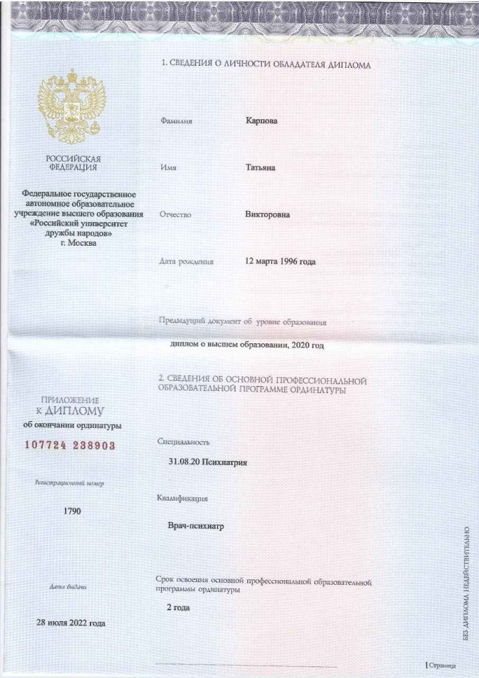 Татьяна Карпова - Психиатр-нарколог медицинской клиники «Гармония» {city_p}